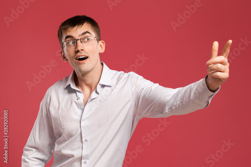 Young man in a classic white shirt is posing over a pink background.