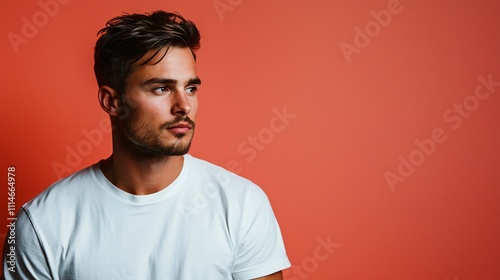 Young man in a white t-shirt poses against a vibrant orange wall in a relaxed setting