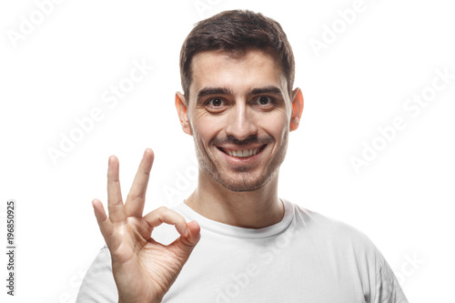 Young man in blank tshirt isolated on white background having happy look, smiling, gesturing, showing OK sign, OK-gesture with his fingers. Body language concept