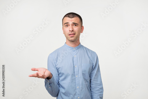 Young man in blue shirt standing disorientated bewildered isolated on gray wall background. Decision making concept.