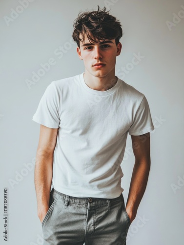 Young Man in Casual White T Shirt and Neutral Grey Trousers Posing Statically Against Plain Light Grey Background with Ample Copyspace for Marketing Text