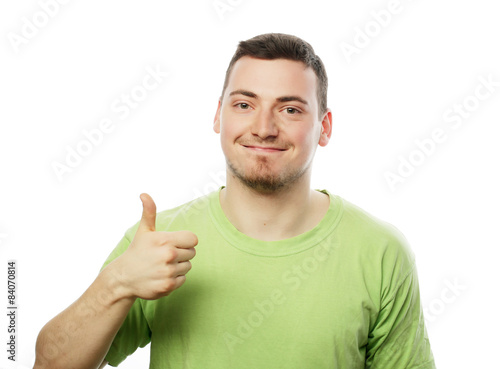 young man in green shirt showing thumbs up.