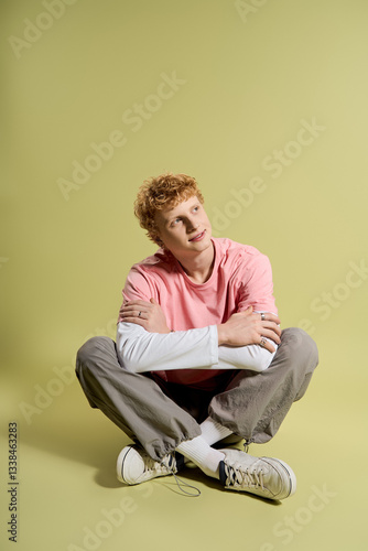 Young man in stylish outfit poses thoughtfully against a vibrant yellow background