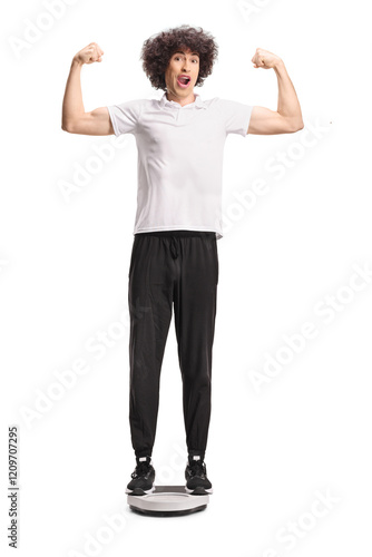Young man in tracksuit showing arm muscles and standing on a weight scale