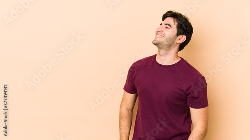 Young man isolated on beige background relaxed and happy laughing, neck stretched showing teeth.