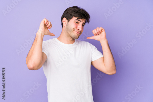 Young man isolated on purple background feels proud and self confident, example to follow.