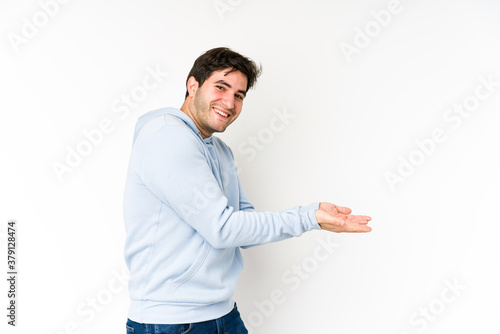 Young man isolated on white background holding a copy space on a palm.