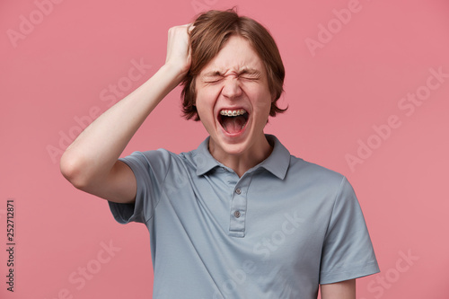 Young man lost in important competition, grabbed his head, tearing the hair on his head, shouts loudly with wide opened mouth, eyes closed, over pink background. People, negative reaction and feelings