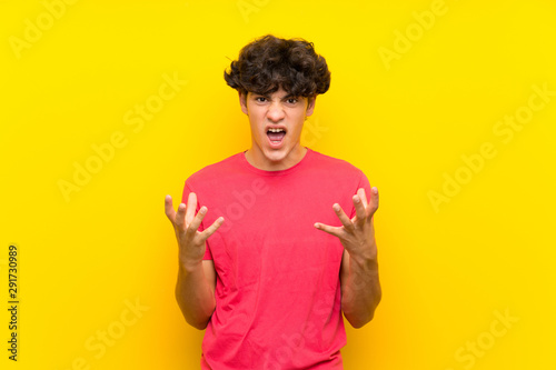 Young man over isolated yellow wall unhappy and frustrated with something
