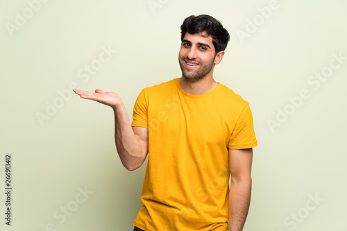 Young man over pink wall holding copyspace imaginary on the palm to insert an ad