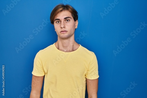 Young man standing over blue background relaxed with serious expression on face. simple and natural looking at the camera.