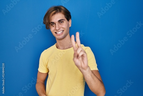 Young man standing over blue background smiling looking to the camera showing fingers doing victory sign. number two.