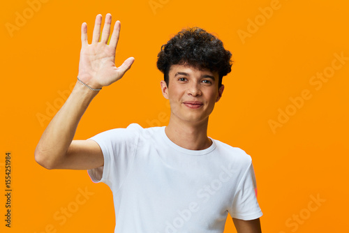 young man waving hand with cheerful smile, curly hair, wearing white t-shirt against vibrant orange background, friendly gesture in casual style