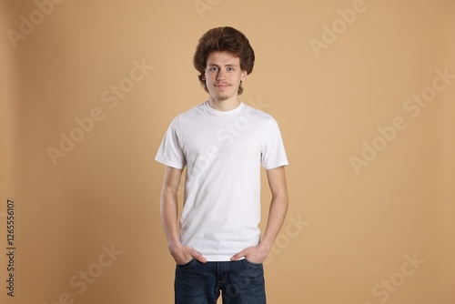 Young man wearing blank white t-shirt on light brown background. Mockup for design