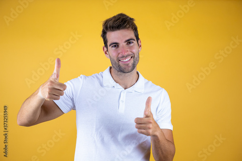Young man wearing casual white t-shirt over yellow isolated background pointing fingers to camera with happy and funny face. Good energy and vibes.
