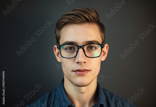 Young man wearing glasses, blue sweater, looking at camera. Young man in glasses and blue sweater makes direct eye contact. Perfect for portraying confidence in business or casual settings.