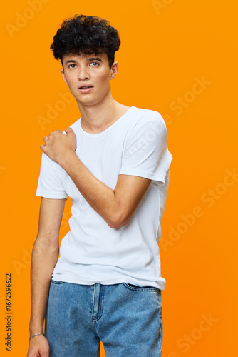 young man wearing white t-shirt and jeans posing thoughtfully with curly hair against bright orange background, casual style and relaxed mood