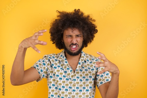 Young man with afro hair over wearing hawaiian shirt standing over yellow background Shouting frustrated with rage, hands trying to strangle, yelling mad.