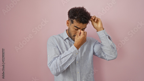 Young man with beard rubs tired eyes while removing glasses, standing against a pink wall, wearing a striped shirt and expressing fatigue.