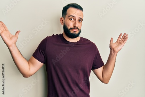 Young man with beard wearing casual t shirt clueless and confused with open arms, no idea and doubtful face.