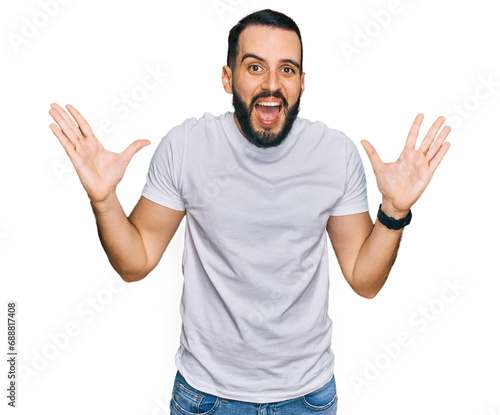 Young man with beard wearing casual white t shirt celebrating crazy and amazed for success with arms raised and open eyes screaming excited. winner concept
