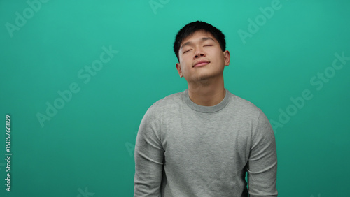 Young man with closed eyes wearing gray sweater against green background expressing tranquility and contentment in a minimalist setting.