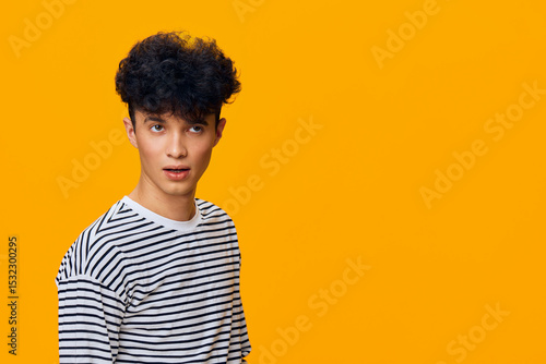 Young man with curly hair wearing a black and white striped shirt posing against a vibrant orange background with a surprised facial expression, casual style.