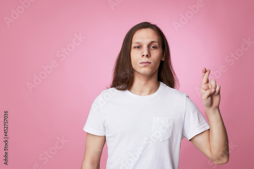 young man with fingers crossed believe in good luck