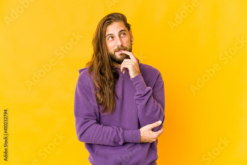 Young man with long hair look relaxed thinking about something looking at a copy space.