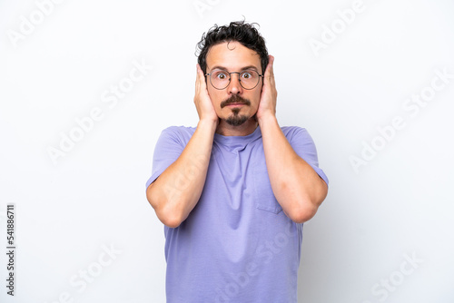 Young man with moustache isolated on white background frustrated and covering ears