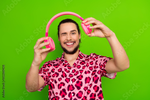 Young man with pink headphones posing on a vibrant green background, wearing a stylish pink leopard print shirt, smiling