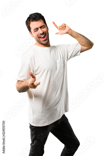 Young man with white shirt enjoy dancing while listening to music at a party on isolated white background