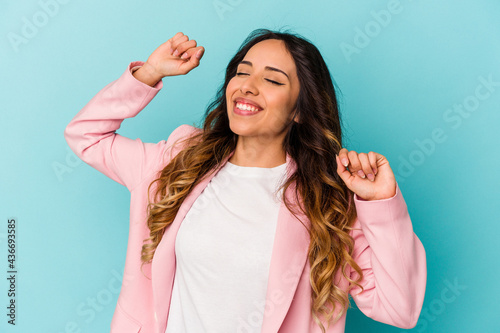 Young mexican woman isolated on blue background celebrating a special day, jumps and raise arms with energy.