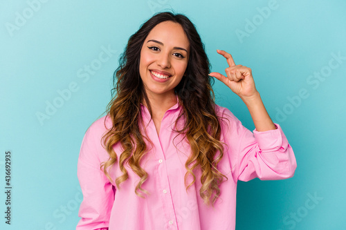 Young mexican woman isolated on blue background holding something little with forefingers, smiling and confident.