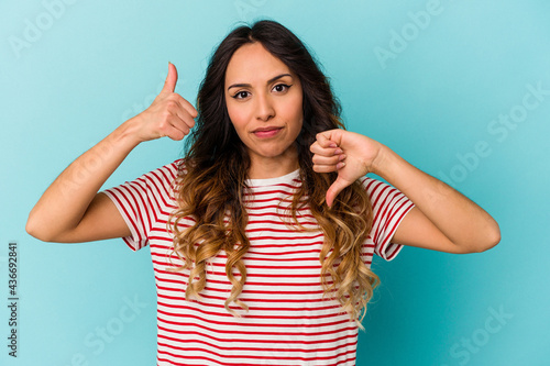 Young mexican woman isolated on blue background showing thumbs up and thumbs down, difficult choose concept