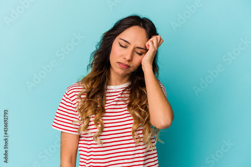 Young mexican woman isolated on blue background tired and very sleepy keeping hand on head.