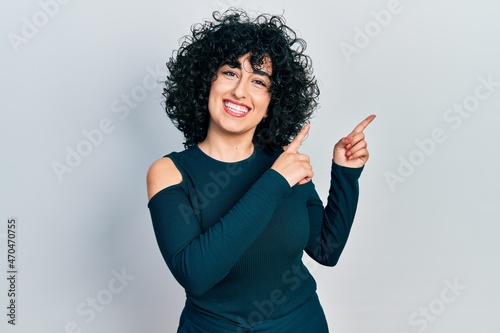 Young middle east woman wearing casual clothes smiling and looking at the camera pointing with two hands and fingers to the side.