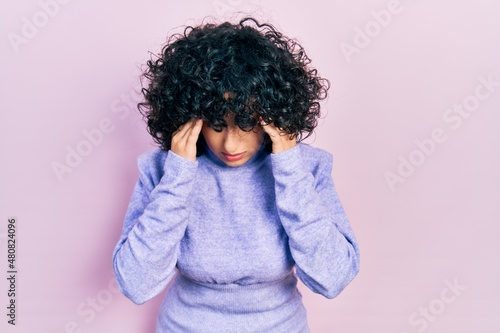 Young middle east woman wearing casual clothes with hand on head for pain in head because stress. suffering migraine.