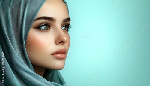 Young Middle Eastern woman wearing turquoise hijab against mint background, showcasing natural makeup and serene expression. Side profile portrait highlights feminine beauty.