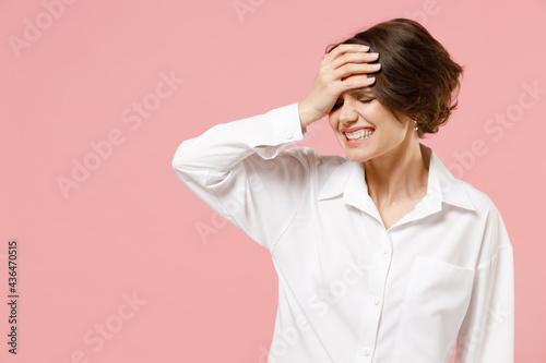 Young mistaken employee business woman corporate lawyer in classic formal white shirt work in office put hand on face facepalm epic fail mistaken omg gesture isolated on pastel pink background studio.