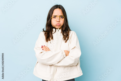 Young mixed race hispanic woman isolated blows cheeks, has tired expression. Facial expression concept.