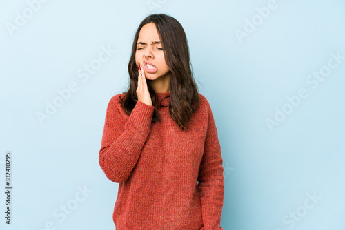 Young mixed race hispanic woman isolated having a strong teeth pain, molar ache.