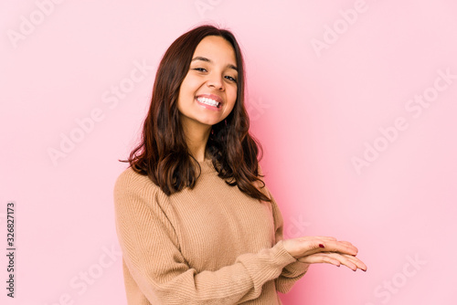Young mixed race hispanic woman isolated holding a copy space on a palm.