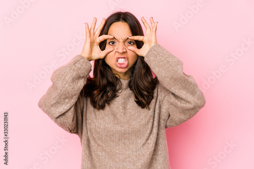Young mixed race hispanic woman isolated keeping eyes opened to find a success opportunity.
