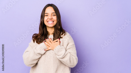 Young mixed race hispanic woman isolated laughing keeping hands on heart, concept of happiness.