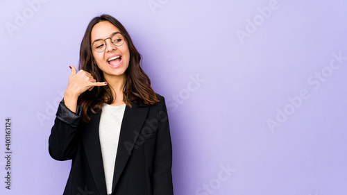 Young mixed race hispanic woman isolated showing a mobile phone call gesture with fingers.