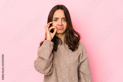 Young mixed race hispanic woman isolated with fingers on lips keeping a secret.