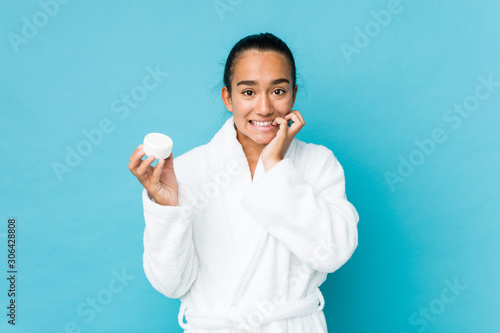 Young mixed race indian holding a moisturizer biting fingernails, nervous and very anxious.