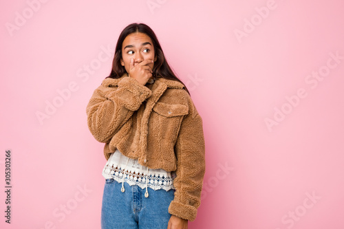 Young mixed race indian woman wearing a short sheepskin coatthoughtful looking to a copy space covering mouth with hand.