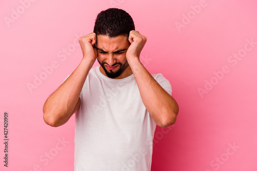Young mixed race man isolated on pink background